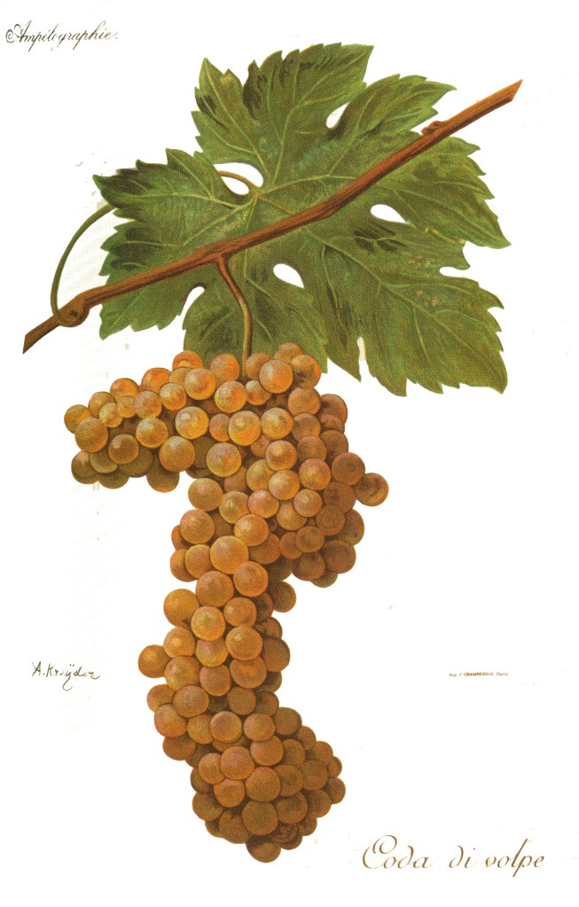 Various sources describe this particular wine as either 100% Coda di Volpe or 100% Caprettone. Mastroberardino itself describes2 their white Lacryma Christi as “Caprettone (o Coda di volpe del Vesuvio) 100%,” which isn’t super helpful when it turns out not everybody realizes they’re two different grapes despite DNA evidence. That said, because Coda di Volpe clusters have a distinct “foxtail” shape, there’s no reason Coda di Volpe and Caprettone should be confused for each other unless there’s a field blend situation where both varieties are growing together and nobody knows how much of either is in the vineyard.